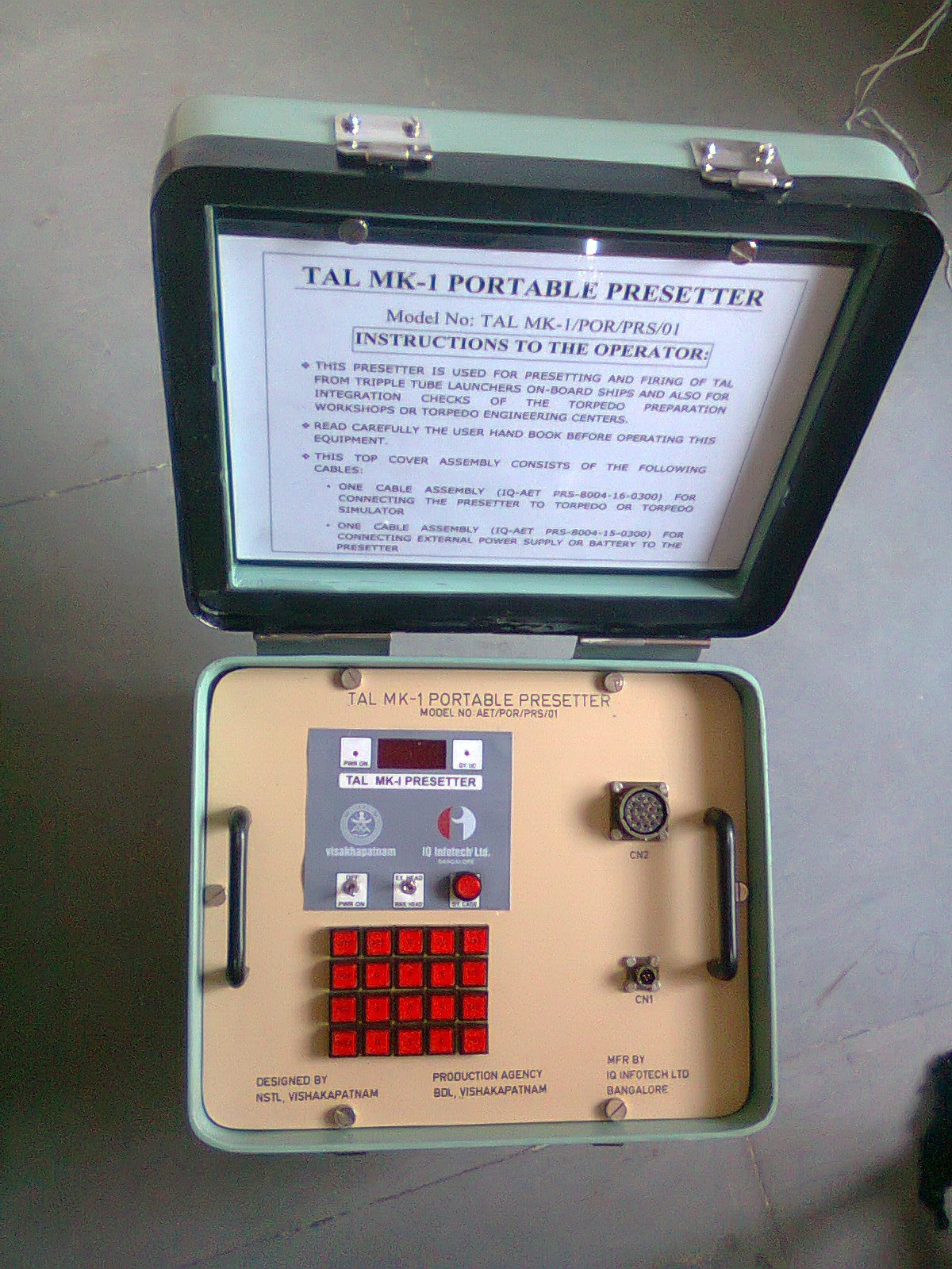 This unit is used to preset the parameters, Monitor and Display the status of subsystem of the TAL Torpedo prior to its launch. Tal-Mk-1 Portable Presetter is used for integration checks during the preparation of torpedo for Launching.