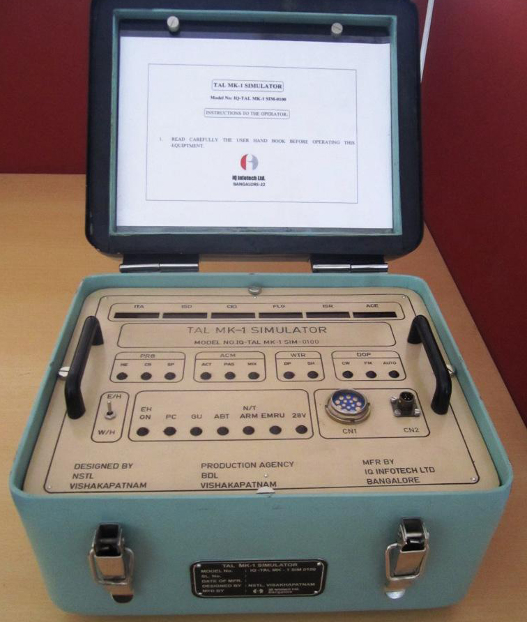 The Torpedo simulator is used for testing TAL Mk-1 Portable Presetter by simulating TAL to ensure the serviceability of Presetter before connecting to the actual torpedo. It is also used by operators for presetting the TAL. The TAL MK-1 simulator is connected electrically to the Presetter through a cable assembly.