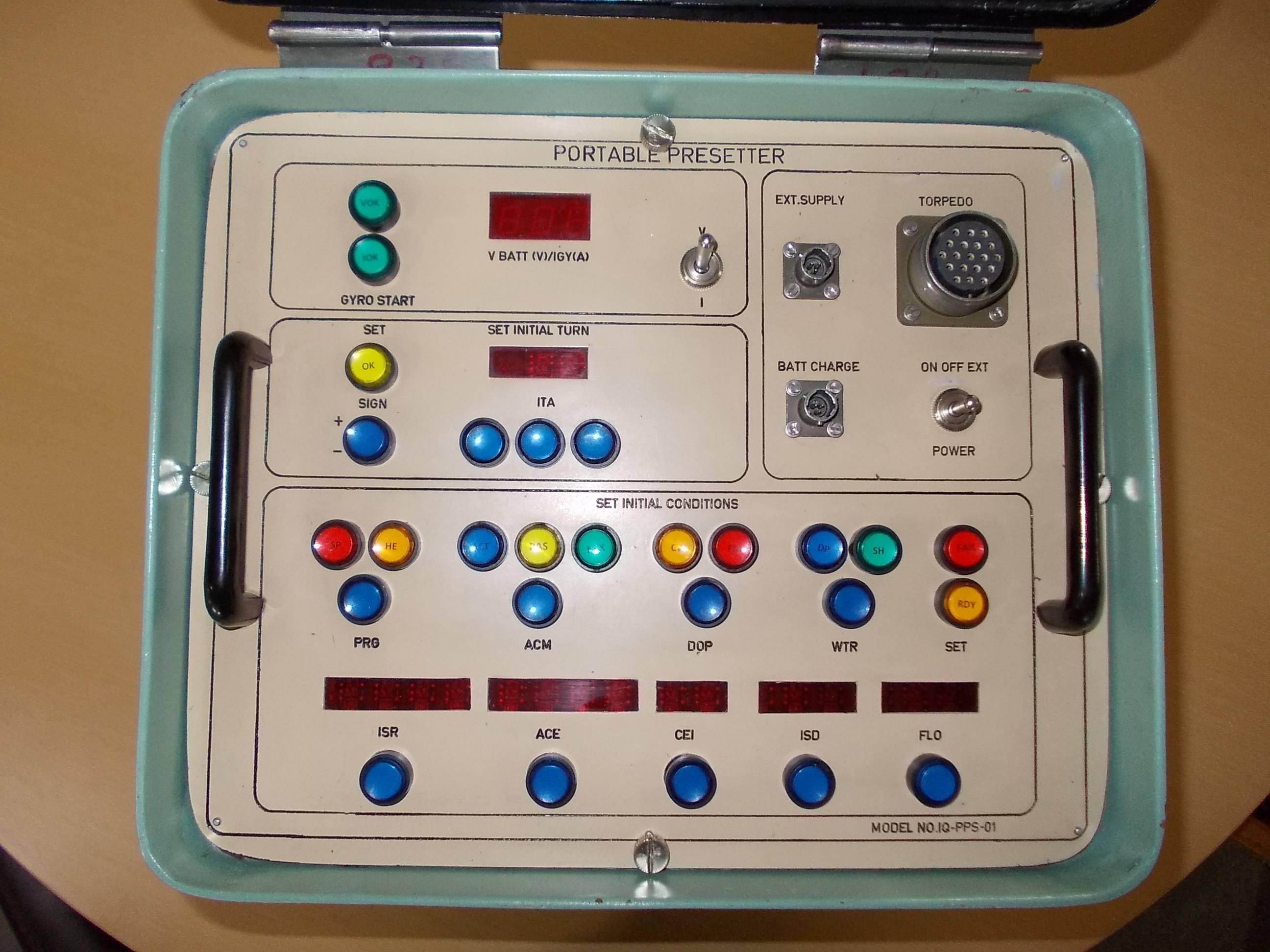 This unit is used to preset the parameters, Monitor and Display the status of subsystem of the A244STorpedo prior to its launch. The entire equipment operates on external power supply or 33.6VDC (NOMINAL), 5.6AH,Re-chargable NiCad Battery which is part of the unit. Tal-Mk-1 Portable Presetter is used for integration checks during the preparation of torpedo for Launching Portable Presetter is used for integration checks during the preparation of A244S torpedo for Launching.