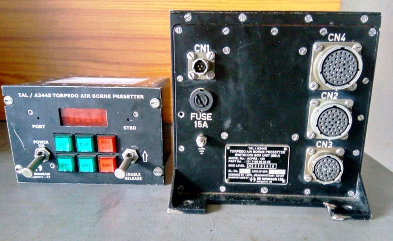 The TAL/A244S Torpedo airborne Presetter is designed to install on chetak /ALH(Advance Light Weight Helicopter) helicopter. The TAL/ A244S Torpedos are electrically propelled light weight Torpedos for operating against submarines in shallow and deep waters.This incorporates a homing head , capable of active,passive or mixed modes for closing onto the target.